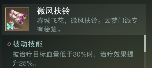 微风扶玲:被治疗目标血量低于30%时,治疗效果提升25%,如果说DPS门派在输出时有斩杀线,那么装备微风扶玲后的云梦女侠也有自己的强效治疗线了,25%治疗效果的提升可以大大保证友方少侠的安全血线。
