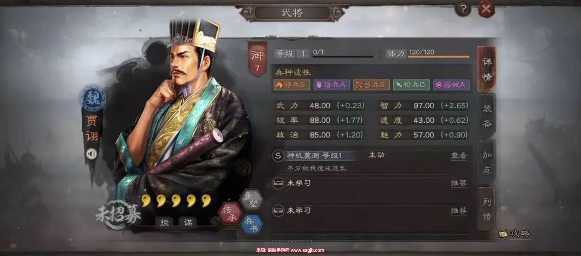 可以看出,曹操跟程昱的战法比较固定,贾诩携带的战法则比较多变,战法不足的也可以将贾诩的备选战法,适当往曹操、程昱身上转移,比如没有抚辑军民的话,可以给曹操携带御敌屏障。
