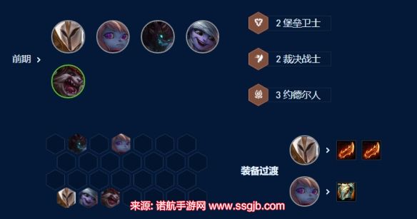 在5人口搜出三星天使、波比、大树后升6人口开出3德玛3约德尔2裁决羁绊。7人口建议补格温或劫开3裁决。7人口不D牌。如果有大连胜且血量优势,可以考虑直接升9人口,这样天使两次登神,吃鸡概率最大。如果中期被断连胜,容错不高,建议在8人口搜大头、皇子、格温和剑魔,去替换掉阵容低费卡。大头替换小炮、皇子替换琴女、格温和剑魔直接上场。